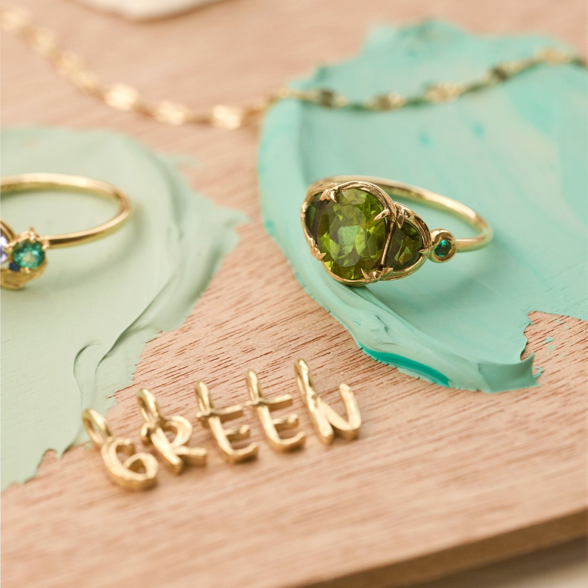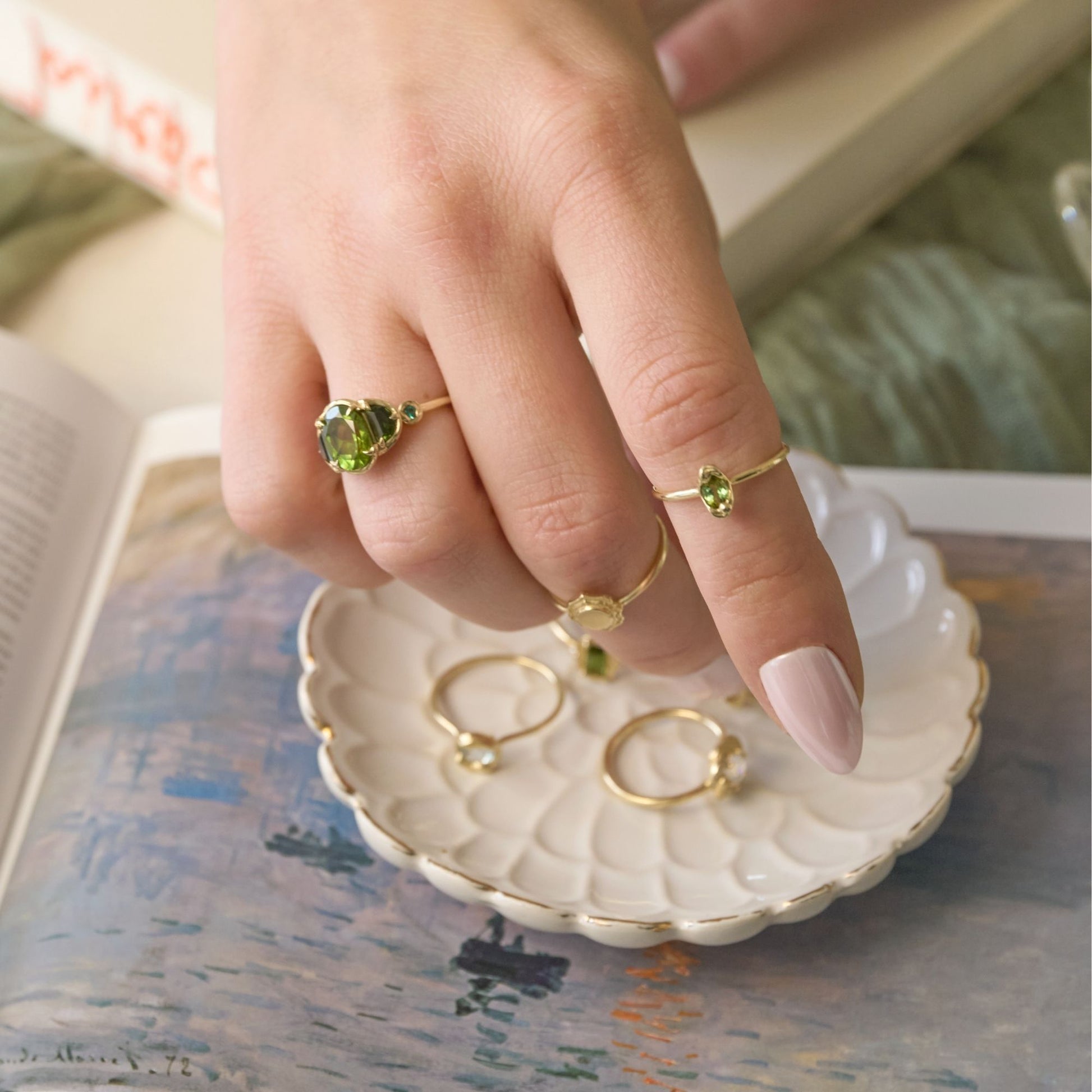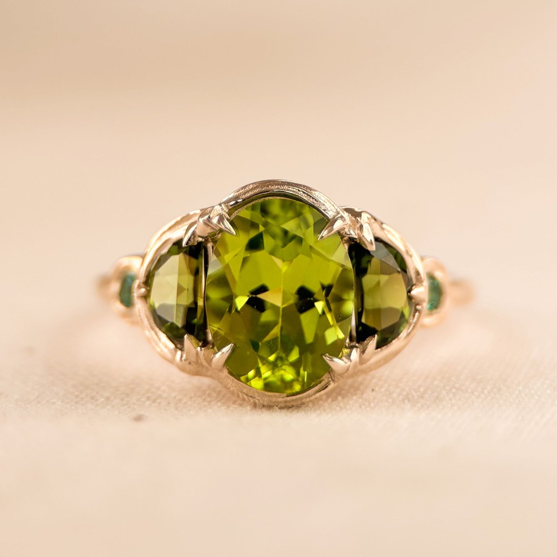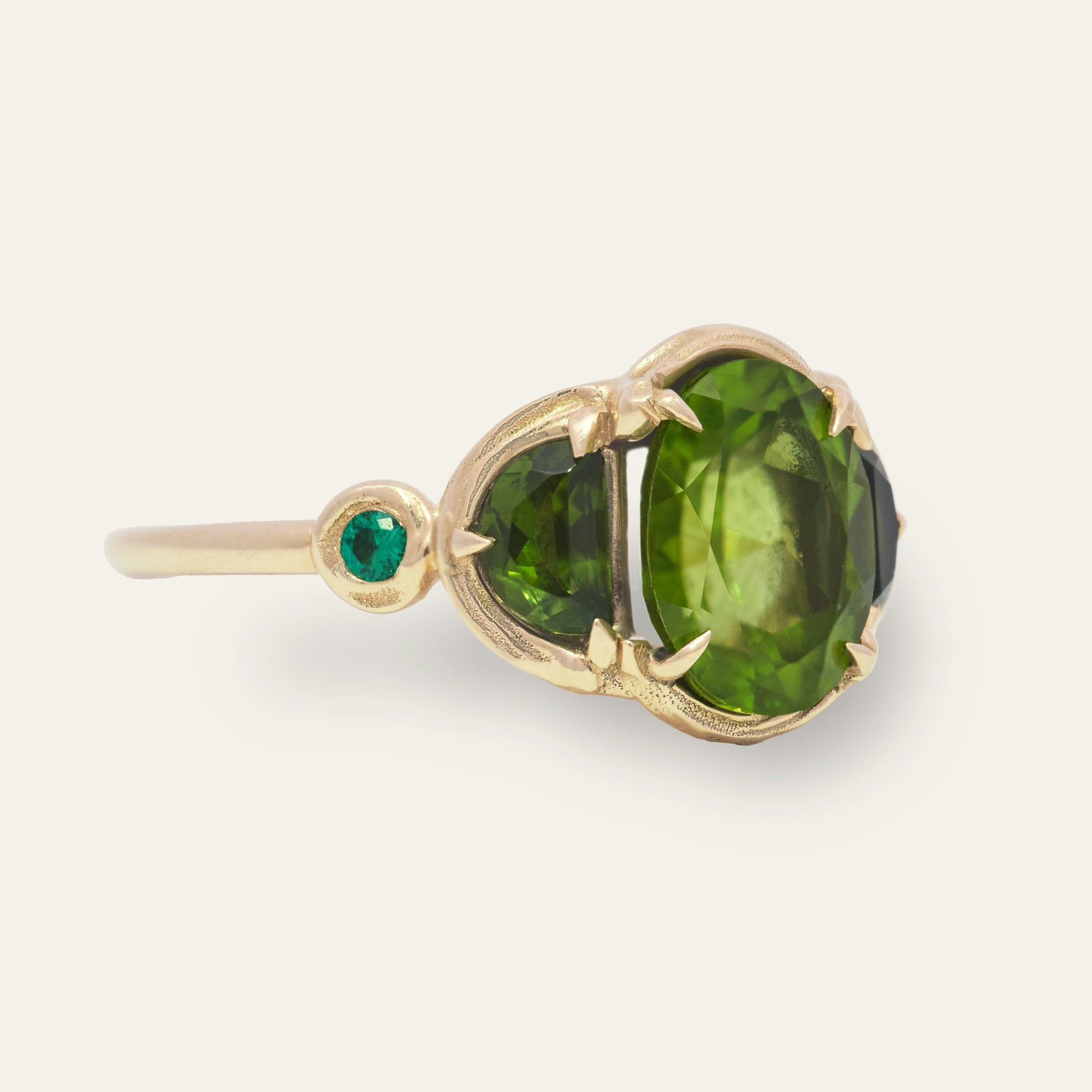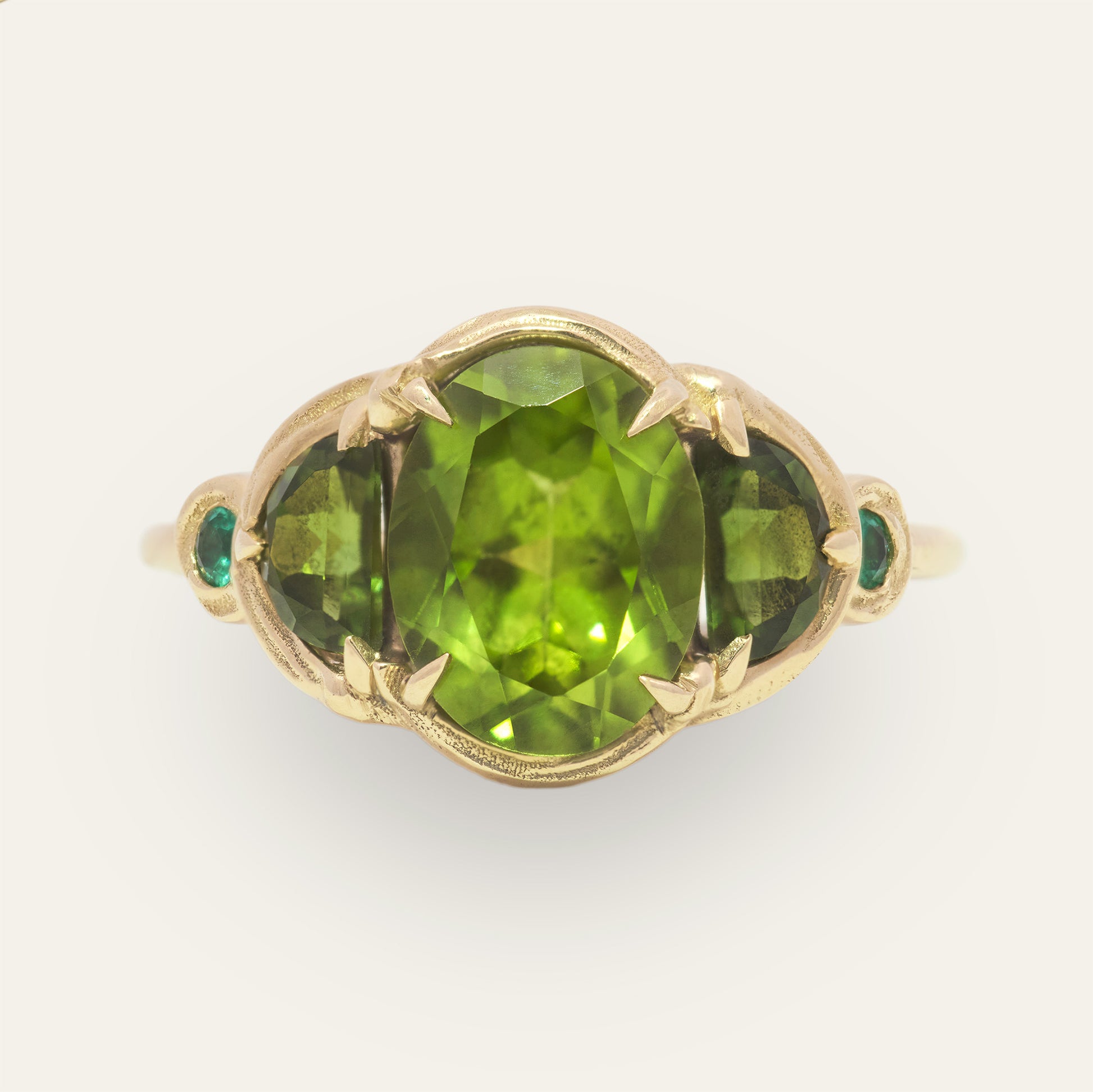 The Willow Green ring celebrates the harmony of nature in full bloom. At its center, a radiant oval peridot glows with fresh, sunlit energy. On either side, half-moon green tourmalines curve gracefully, their bold shapes softened by delicate emerald accents nestled in the gold setting. Echoing the sway of willow branches and the layered greens of a summer garden, this ring is a graceful study in movement, balance, and the beauty of organic form.