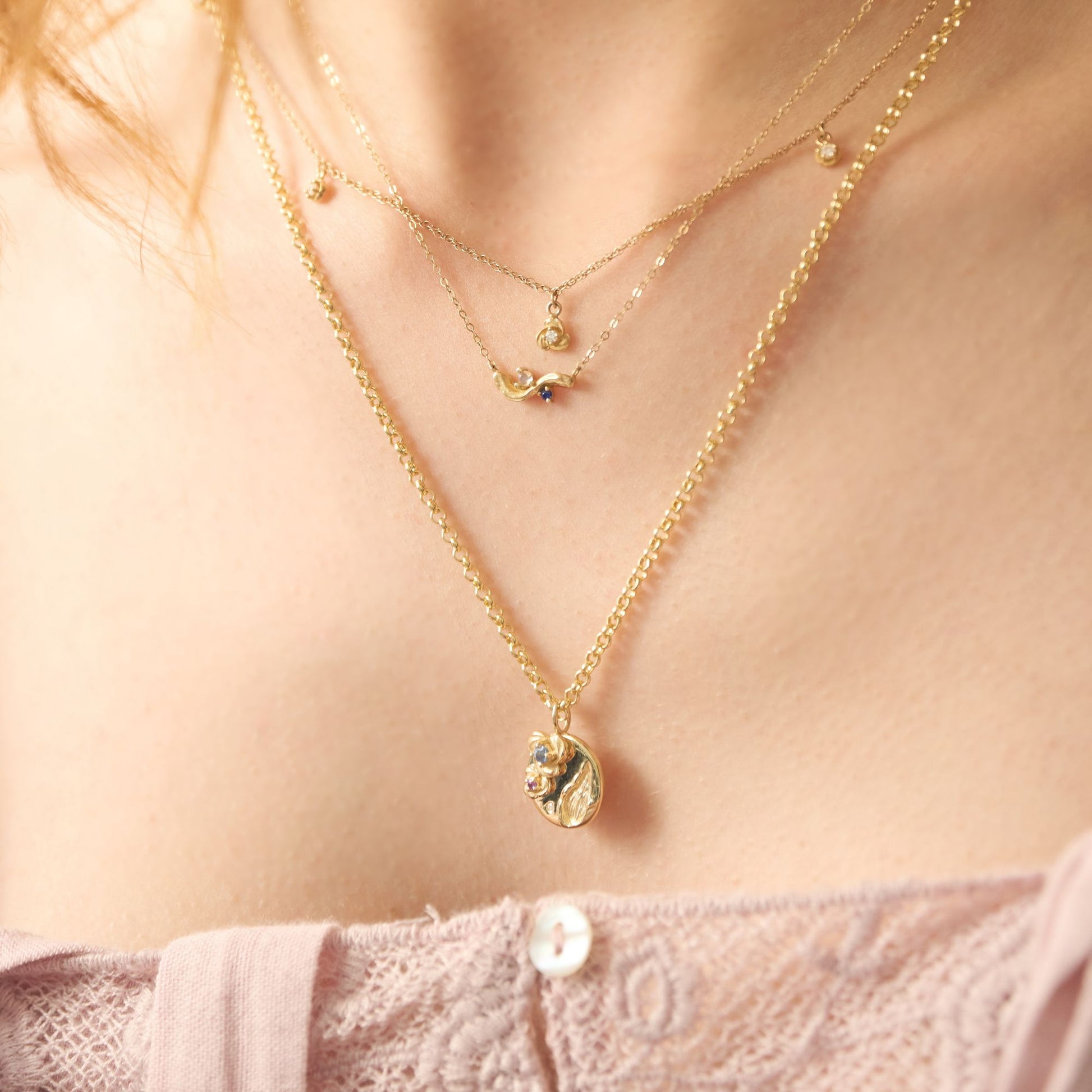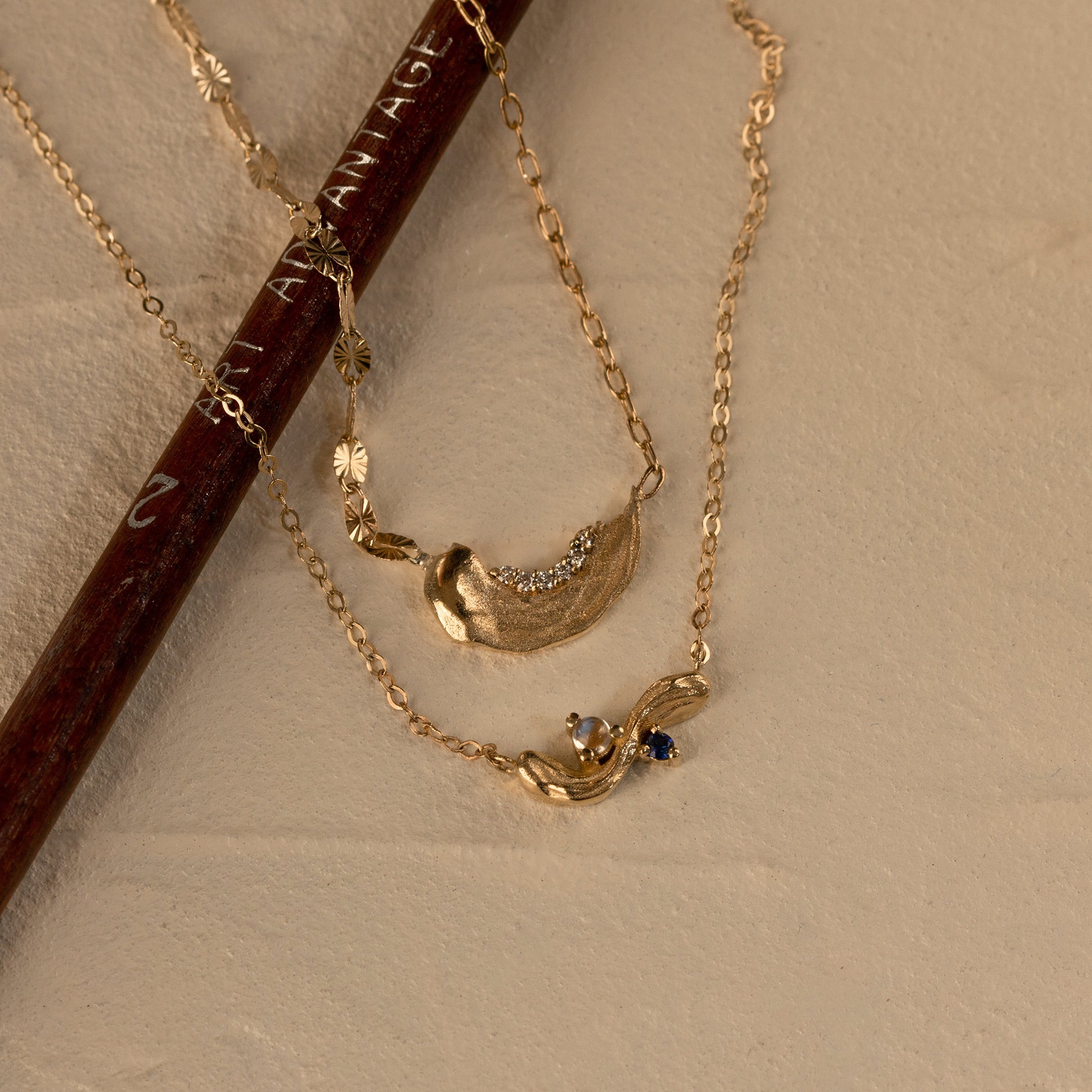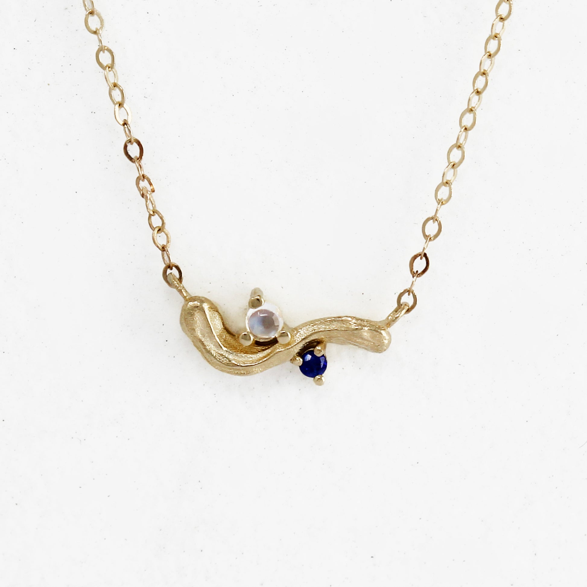 Inspired by Van Gogh’s timeless masterpiece, The Starry Night (1889), the Zephyr Blue Necklace weaves together creamy, ripple-like brushstroke textures with celestial hues. A glistening zephyr blue moonstone, accompanied by a deep royal-navy sapphire that shimmers like a midnight sky, is suspended on a lustrous gold chain – an ode to cosmic beauty and artistic brilliance.